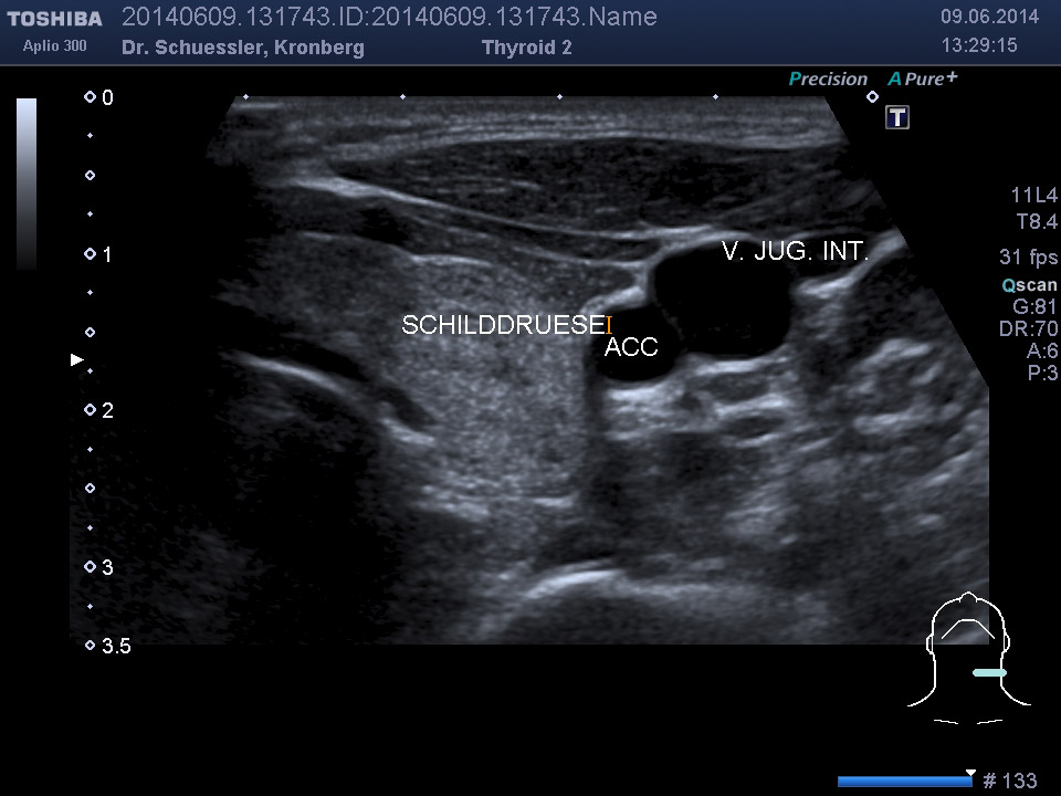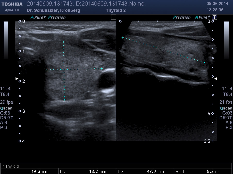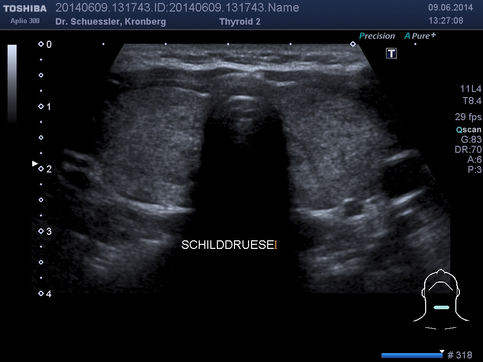 Mit dieser Untersuchung lassen sich die Schilddrüsengröße, ihre Struktur und auch Knoten, Zysten oder entzündliche Veränderungen sichtbar machen. Durch Hinzunahme der Farbkodierung lässt sich auch die Durchblutungssituation der Schilddrüse sichtbar machen.